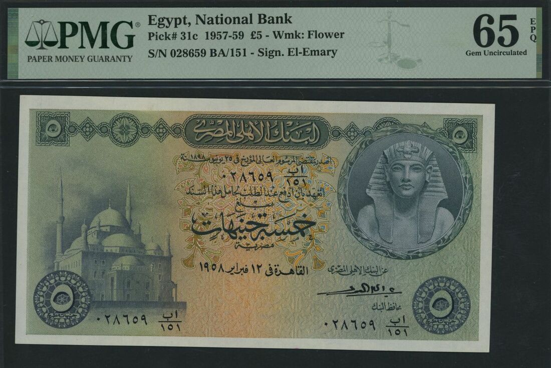 (x) National Bank of Egypt, £5, 12th February 1958, serial number 028659 BA/151 (Pick 31c, BNB 131), in PMG holder 65 EPQ Gem Uncirculated