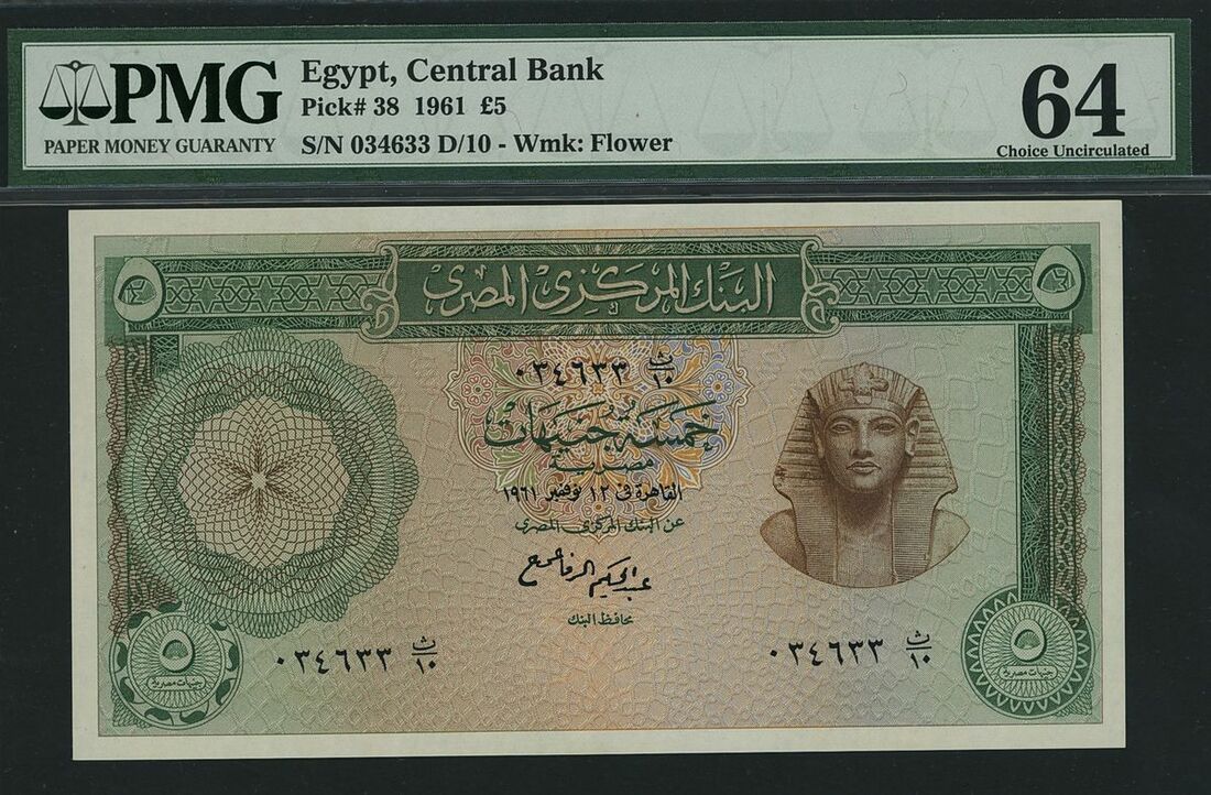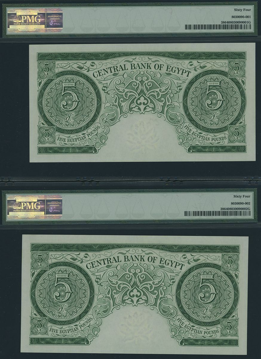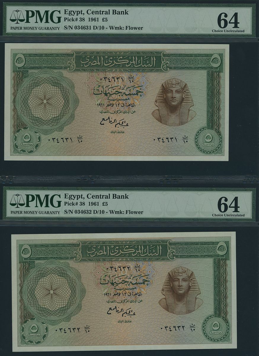 (x) Central Bank of Egypt, Consecutive trio of 5£, 1961, serial number 034631-3 D/10, (Pick 38, BNB 304), in PMG holder 64 Choice Uncirculated