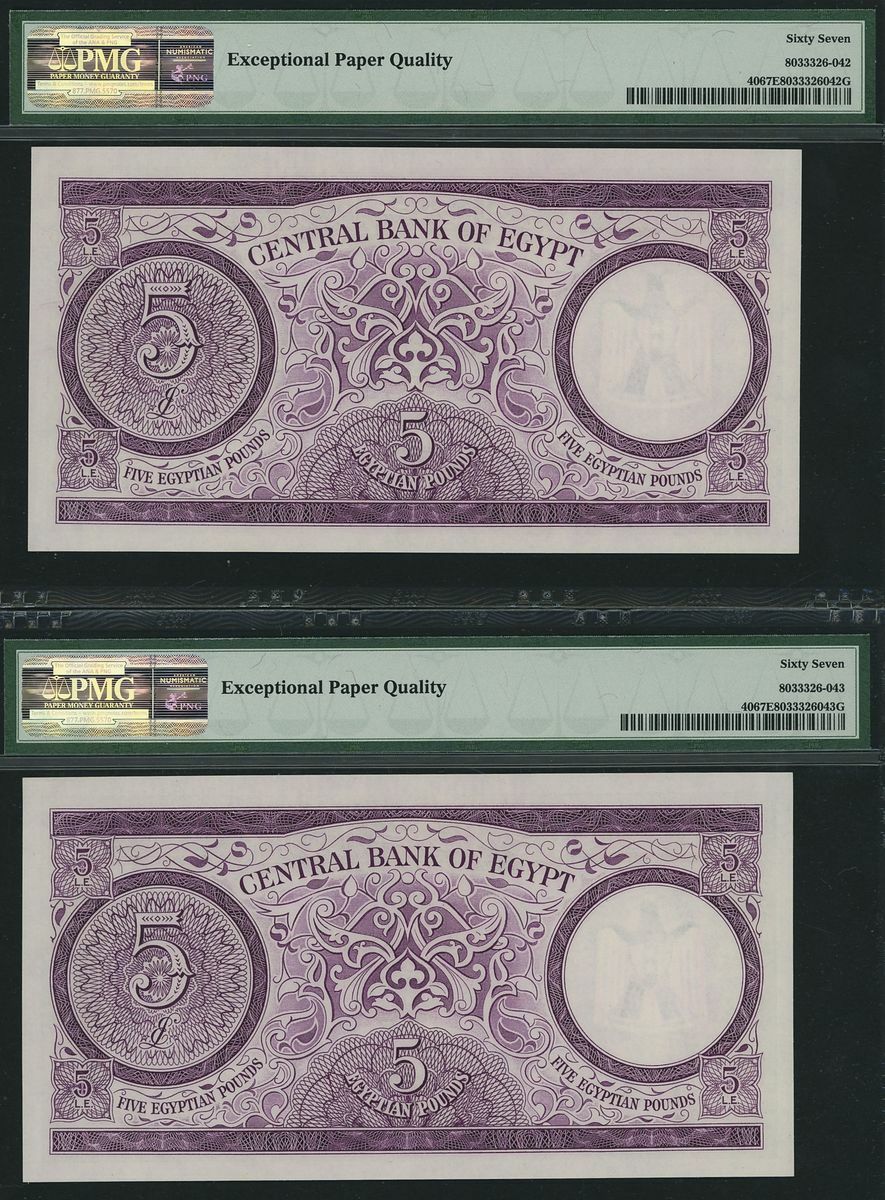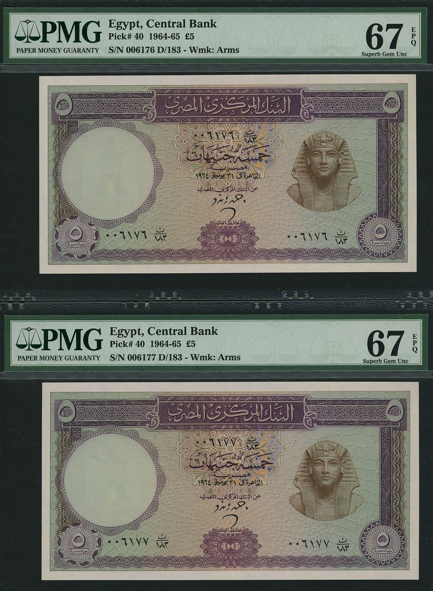 (x) Central Bank of Egypt, Consecutive pair of £5, (1964-65), serial numbers 006176-7 D/183, (Pick 40, BNB 306), in PMG holder 67 EPQ Superb Gem Uncirculated (2 notes)