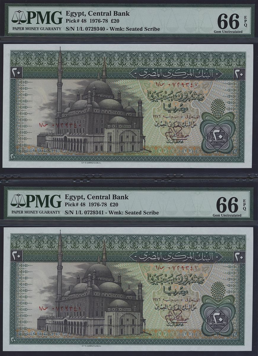(x) Central Bank of Egypt, Consecutive pair of £20, (1976-78), serial numbers 1/L 0729340-1, (Pick 48, BNB 314), in PMG holder 66 EPQ Gem Uncirculated