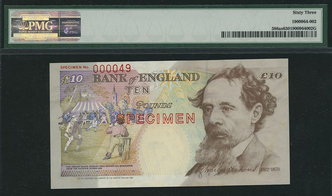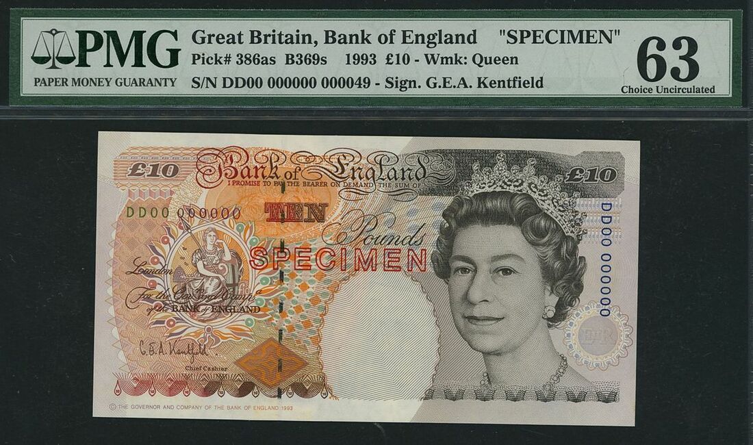 (x) Bank of England, G.E.A. Kentfield, specimen £10, 1993, serial number DD00 000000 000049, (EPM B369s, Pick 386as), in PMG holder 63 Choice Uncirculated