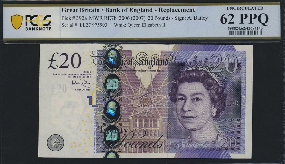 (x) Bank of England, Great Britain, Replacement £20, 2006 (2007), serial number LL27 975903, (Pick 392a, BNB 201), in PCGS holder 62 PPQ Uncirculated