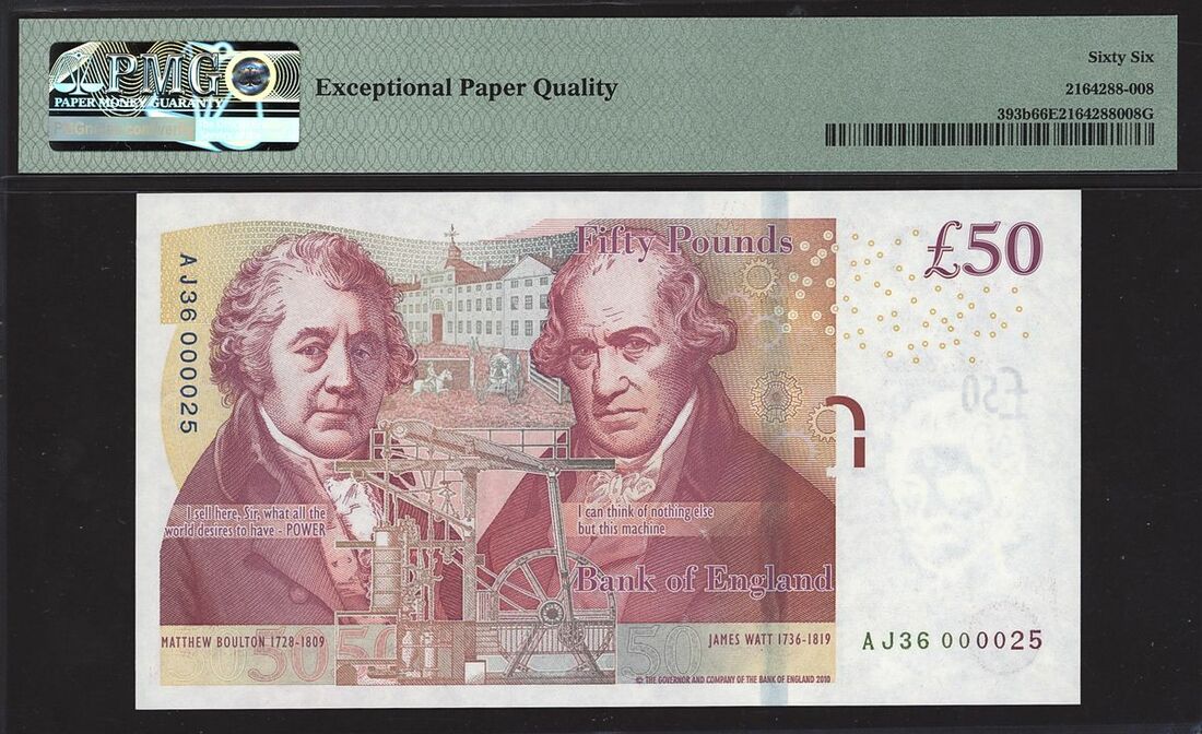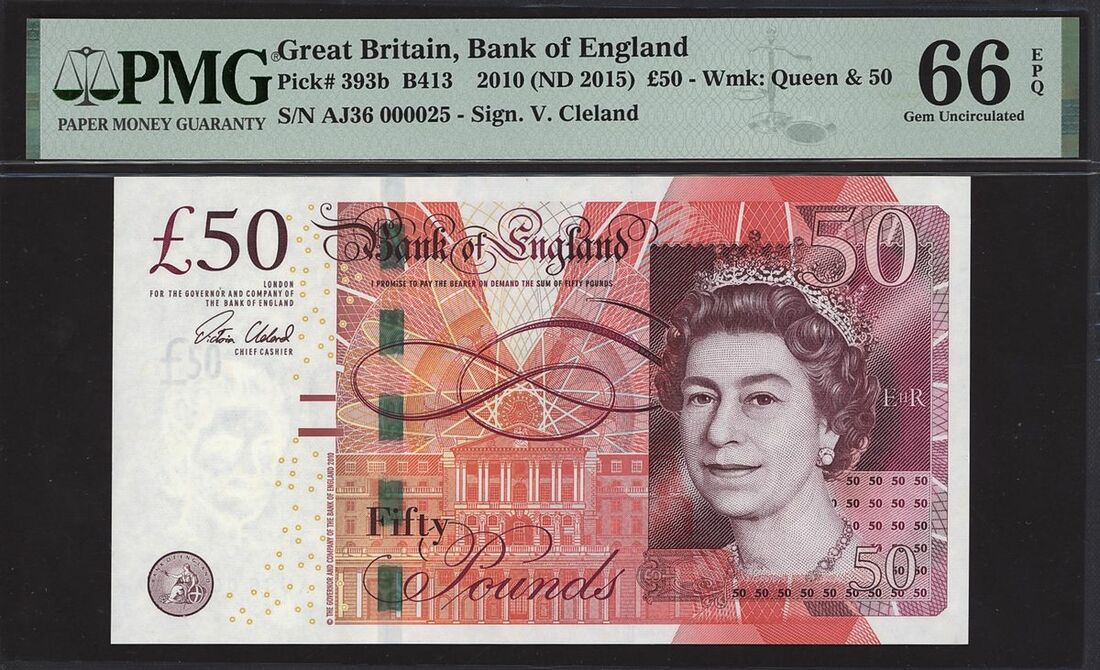 Bank of England, V. M. F. Cleland, £50, 2010 (ND 2015), serial number AJ36 000025, (EPM B413, Pick 393b), in PMG holder EPQ 66 Gem Uncirculated