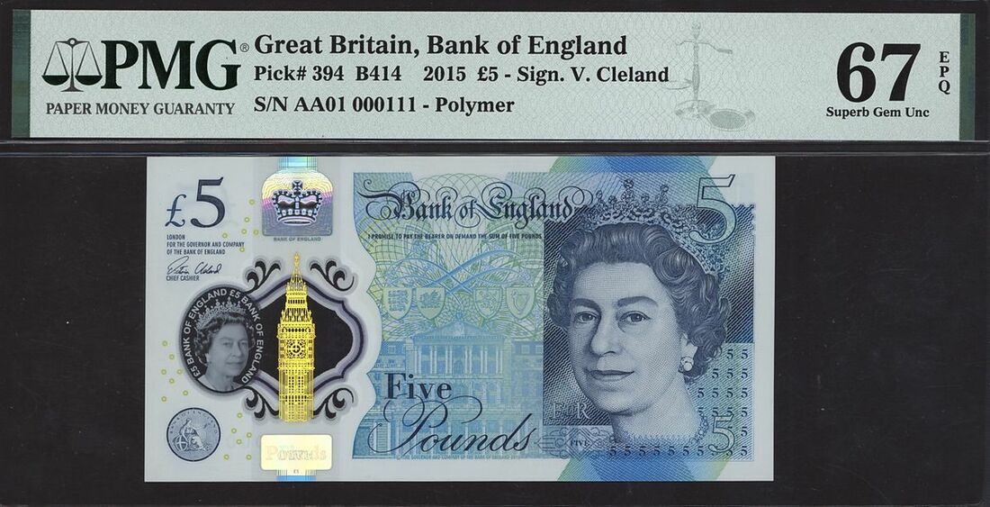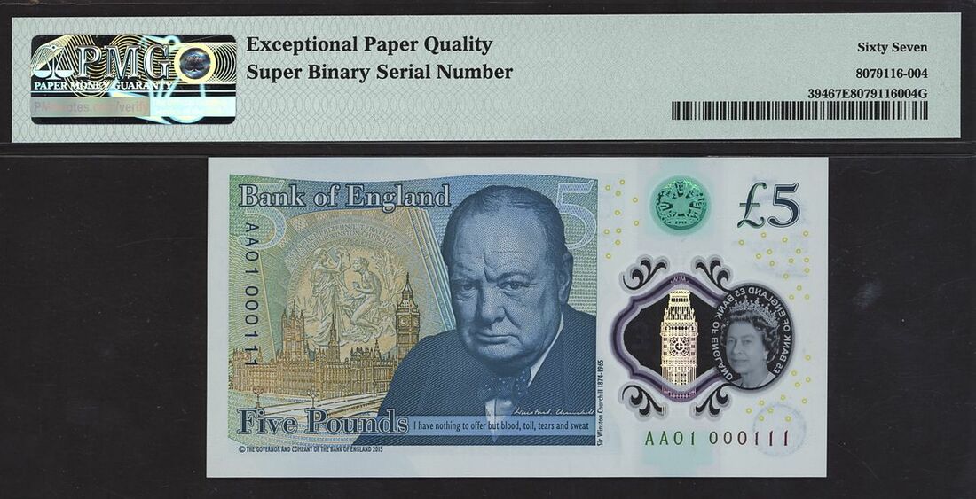 Bank of England, Victoria Cleland, £5, ND (2016), serial number AA01 000111, printed on polymer, blue on green, Queen Elizabeth II at right, Bank of England building at low centre, see-through window security feature with metallic foil of Elizabeth Tower and clearly defined portrait of Queen Elizabeth II at left, reverse, Winston Churchill at centre, Houses of Parliament at left