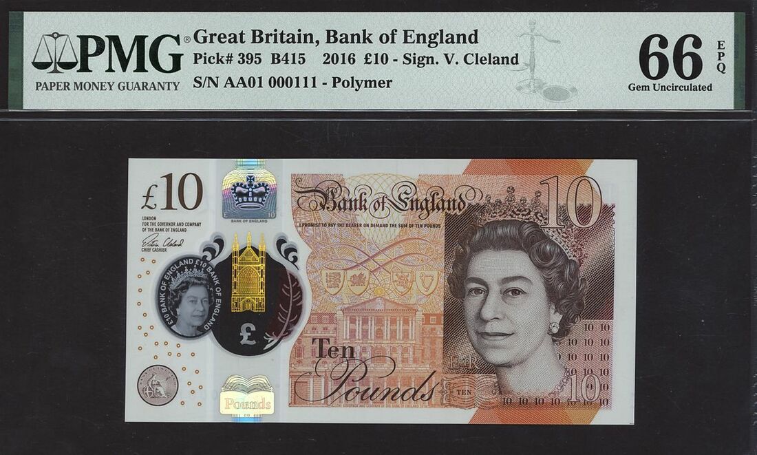 (Pick 395, EPM B415), in PMG holder 66 EPQ Gem Uncirculated, Super Binary Serial Number, Ex BoE Charity Auction (17039, lot 3701).