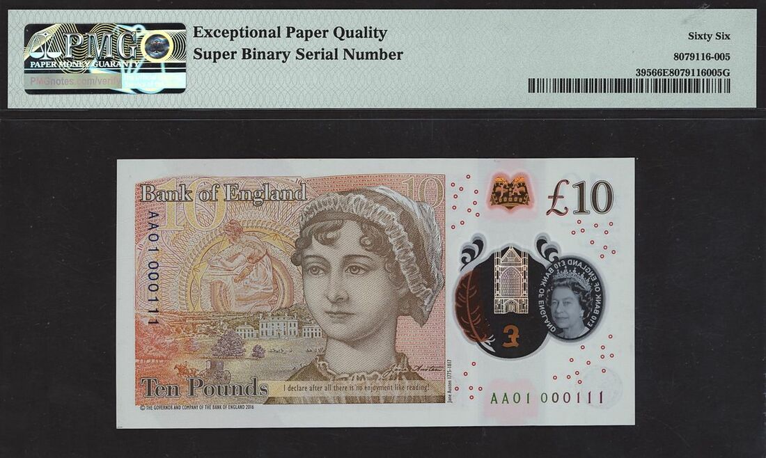Bank of England, Victoria Cleland, Polymer £10 ND (14 September 2017), serial number AA01 000111, orange-brown, Queen Elizabeth II at right, transparent window at left with portrait of the Queen and view of Winchester Cathedral, the latter highlighted in gold. To the right of Winchester Cathedral is a quill, which shows as orange or purple depending on angle of view. Reverse orange-brown, a portrait of Jane Austen. To her left is an illustration of Elizabeth Bennet, the central character in 'Pride and Prejudice'. A foil silver image at left depicts Winchester Cathedral