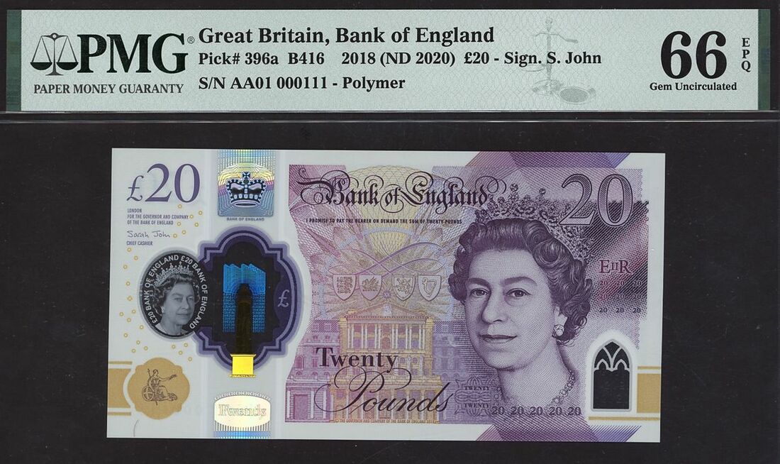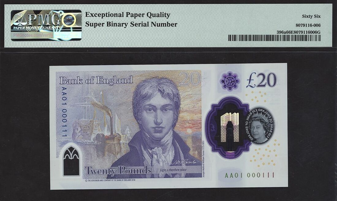 Bank of England, Sarah John, polymer £20, ND (20 February 2020), serial number AA01 000111, purple and multicoloured, Queen Elizabeth II at right and in a transparent window at left with text £20 BANK OF ENGLAND. Margate lighthouse in gold and the Turner Contemporary in blue appear over the window, a second smaller window based on Tintern Abbey low right. Reverse purple, a self-portrait of Turner and his painting of The Fighting Temeraire in field, a purple foil patch at upper right with letter T is based on the staircase at the Tate Britain