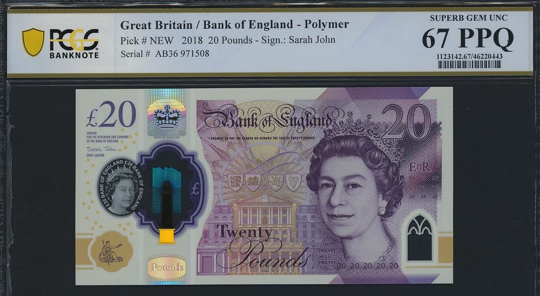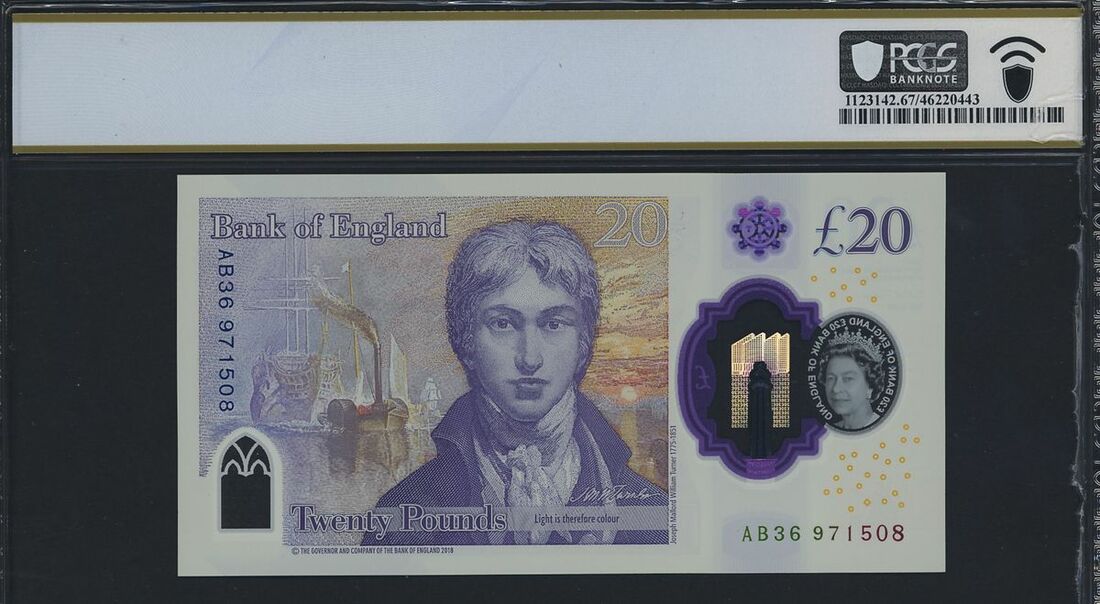 (x) Bank of England, Great Britain, £20, 2018, serial number AB36 971508, (Pick 396a, BNB 205), in PCGS holder 67 PPQ Superb Gem Uncirculated