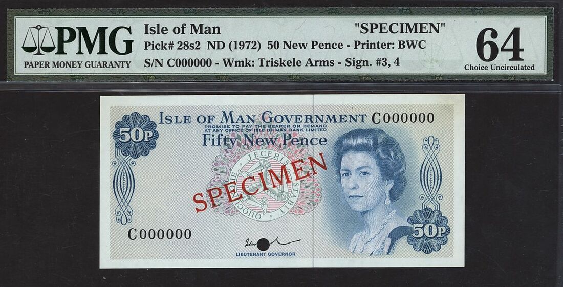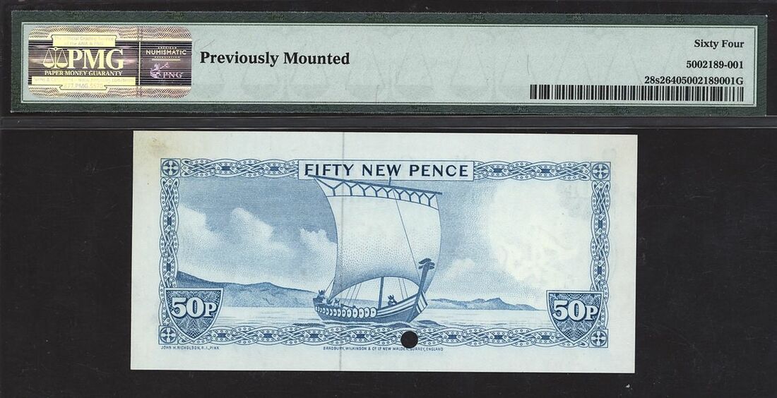 (x) Isle of Man Government, Isle of Man, specimen 50 New Pence, ND (1972), serial number C000000, (Pick 28, BNB 105), in PMG holder 64 Choice Uncirculated, previously mounted