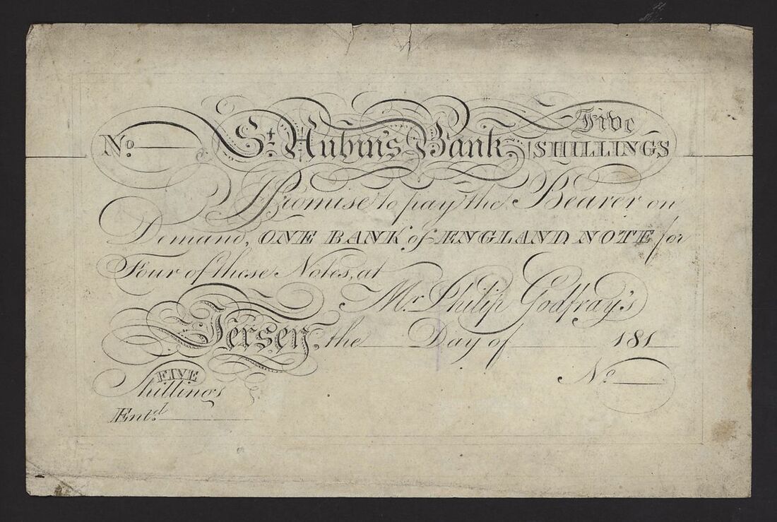 St. Aubin's Bank, Jersey, proof 5 shillings, 181-, no previous record of this note to our knowledge
