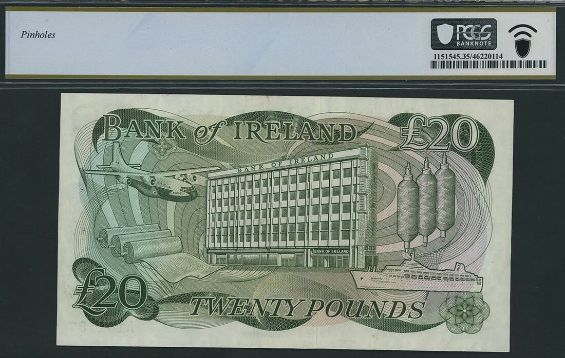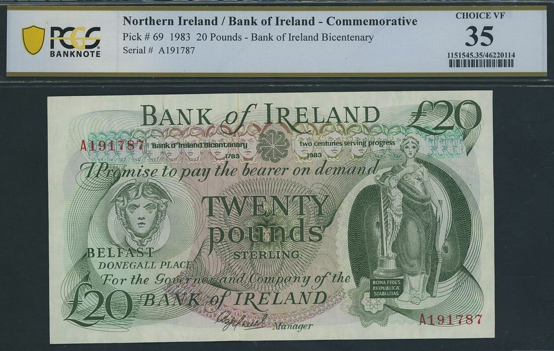 (x) Bank of Ireland, Northern Ireland, Commemorative 20 Pounds, 1983, serial number A191787, (Pick 69, BNB 113), in PCGS holder 35 Choice Very Fine, Pinholes