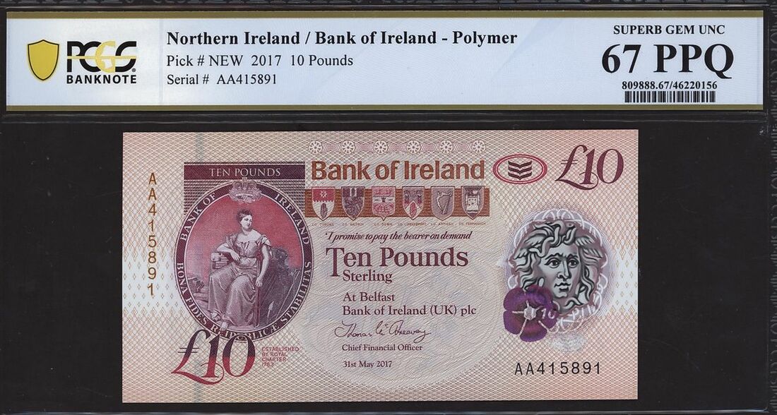 (x) Bank of Ireland, Northern Ireland, £10, 31st May 2017, serial number AA415891, (Pick 91a, BNB 137), in PCGS holder 67 PPQ Superb Gem Uncirculated