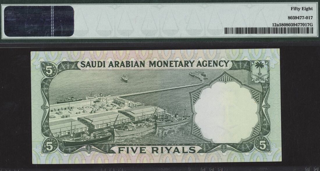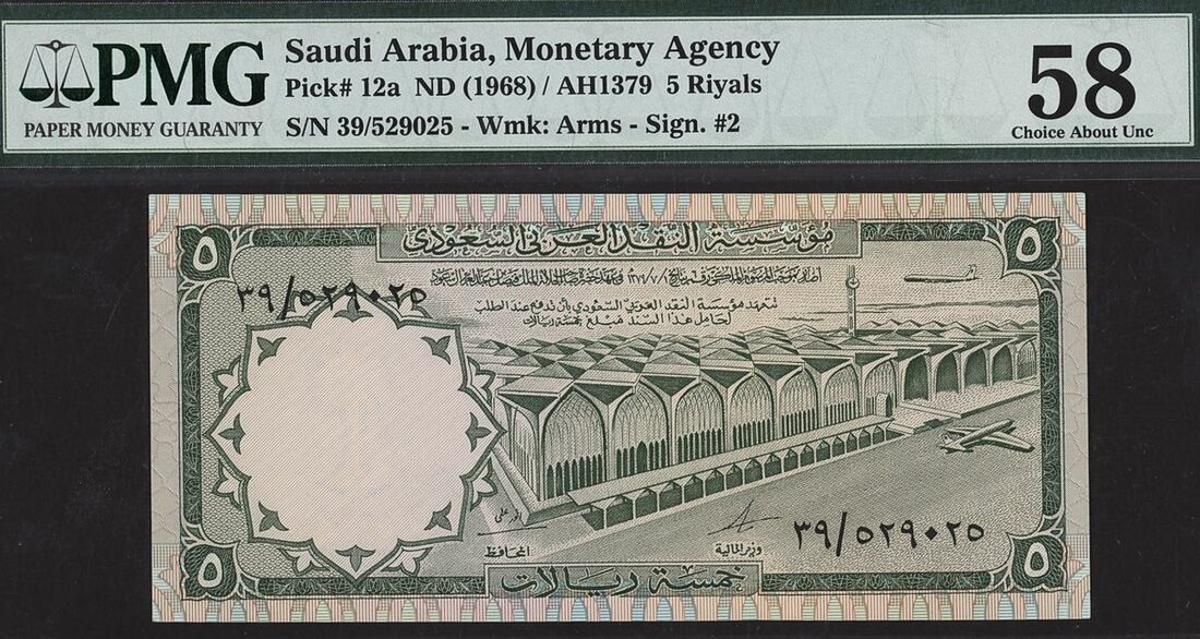 (x) Saudi Arabia Monetary Agency, 5 Riyals, ND (1968), serial number 39/529025, (Pick 12a, BNB 111), in PMG holder 58 Choice About Uncirculated