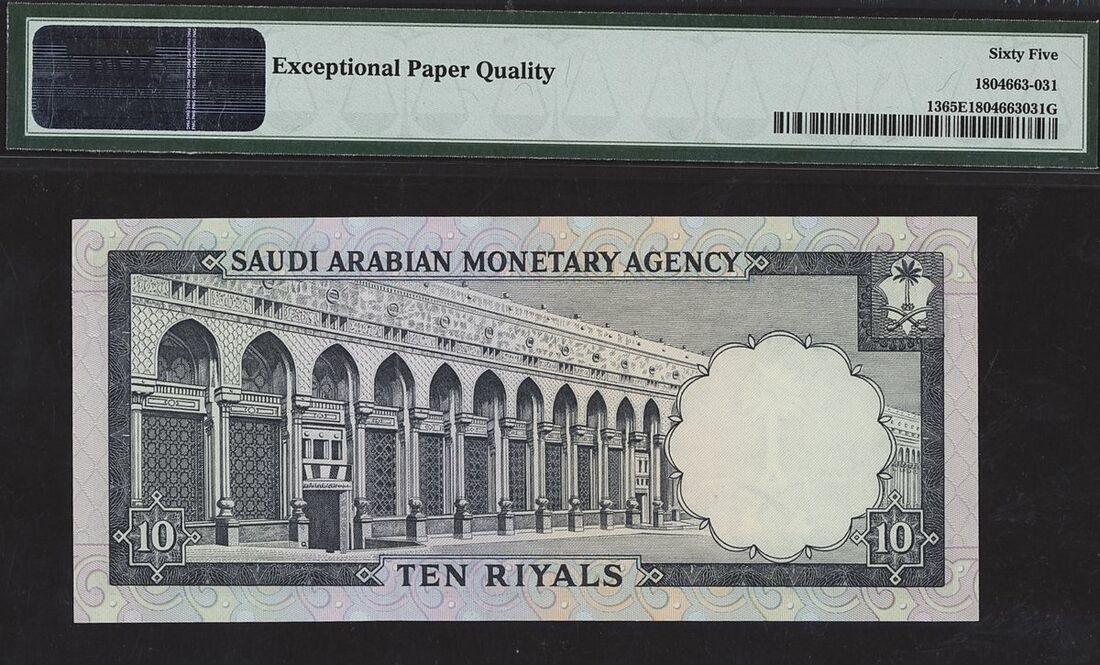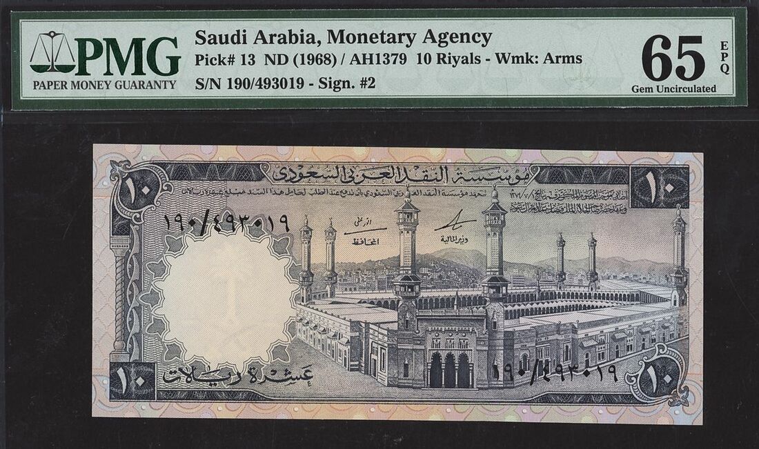 (x) Saudi Arabia Monetary Agency, 10 Riyals, ND (1968), serial number 190/493019, (Pick 13, BNB 112), in PMG holder 63 EPQ Gem Uncirculated