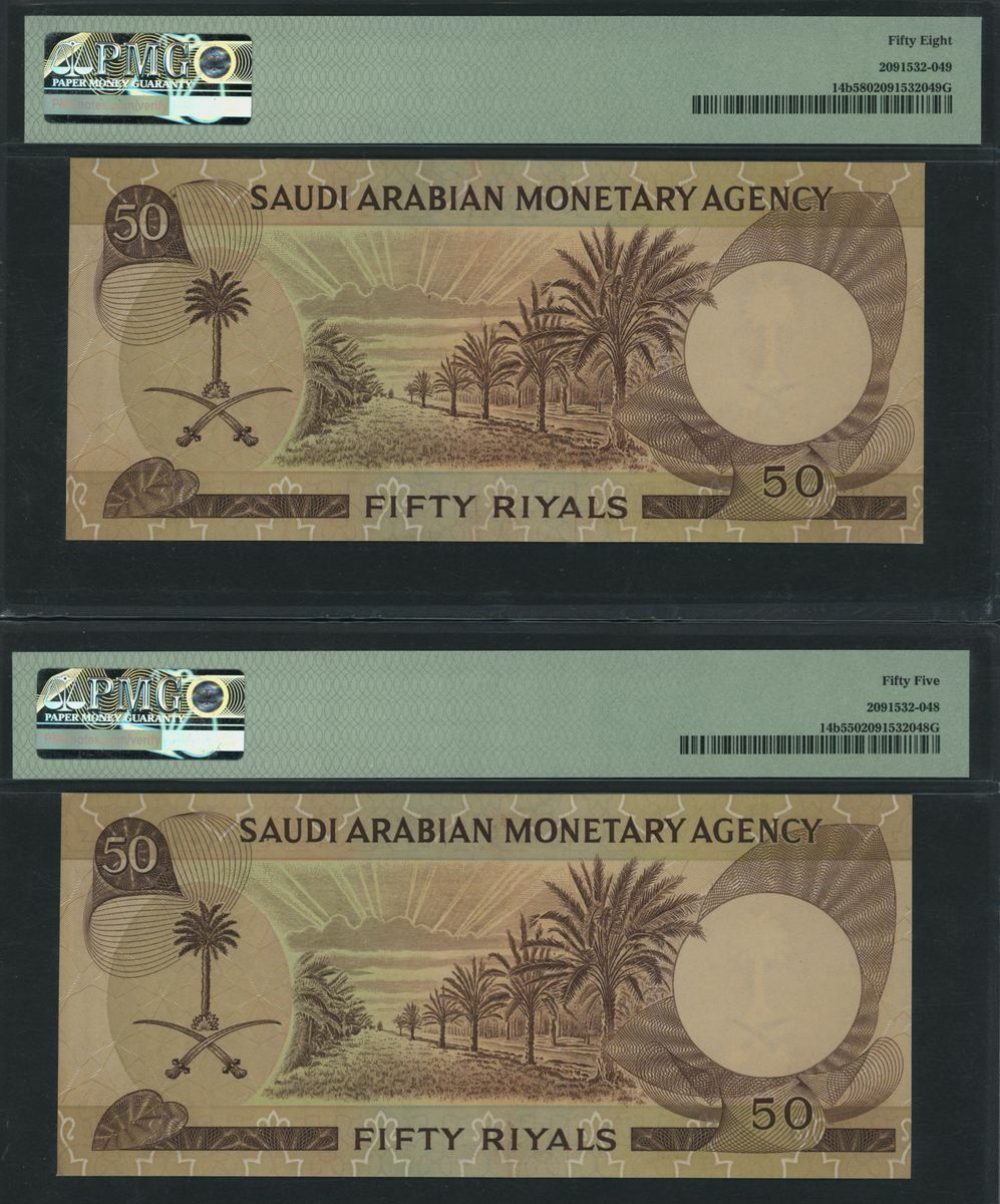 (x) Saudi Arabia Monetary Agency, Consecutive pair of 50 Riyals, ND (1968), serial number 55/900258-59, (Pick 14b, BNB 113), in PMG holder 58 Choice About Uncirculated (1), 55 About Uncirculated (1), (2 notes)