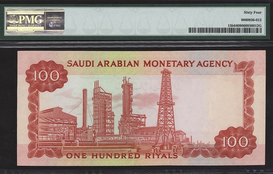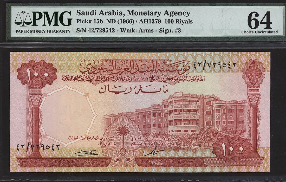 (x) Saudi Arabia Monetary Agency, 100 Riyals, ND (1966), serial number 42/729542, (Pick 15b, BNB 114), in PMG holder 64 Choice Uncirculated