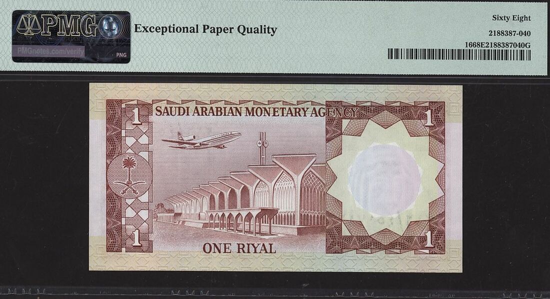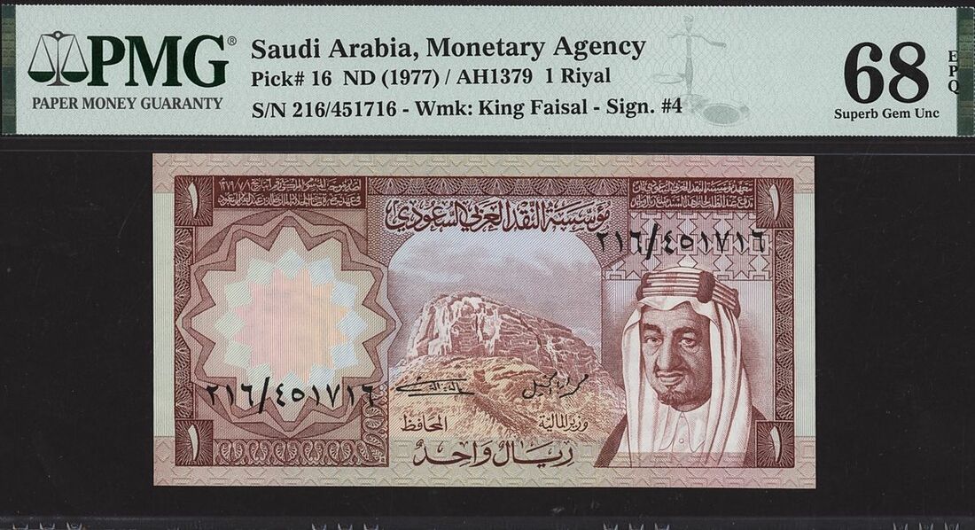 (x) Monetary Agency, Saudi Arabia, 1 Riyal, ND (1977), serial number 216/451716, (Pick 16, BNB 115), in PMG holder 68 EPQ Superb Gem Uncirculated