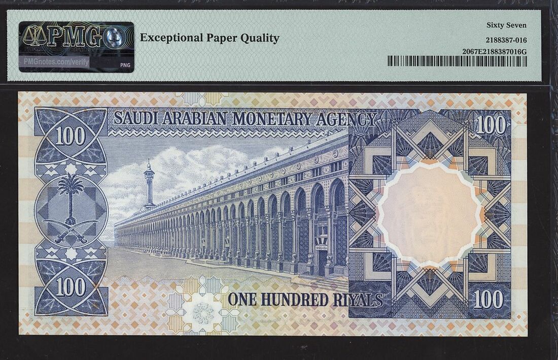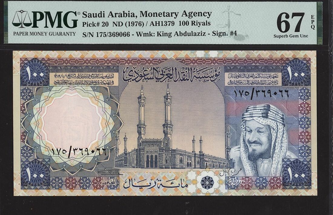 (x) Monetary Agency, Saudi Arabia, 100 Riyals, ND (1976), serial number 175/369066, (Pick 20, BNB 119), in PMG holder 67 EPQ Superb Gem Uncirculated