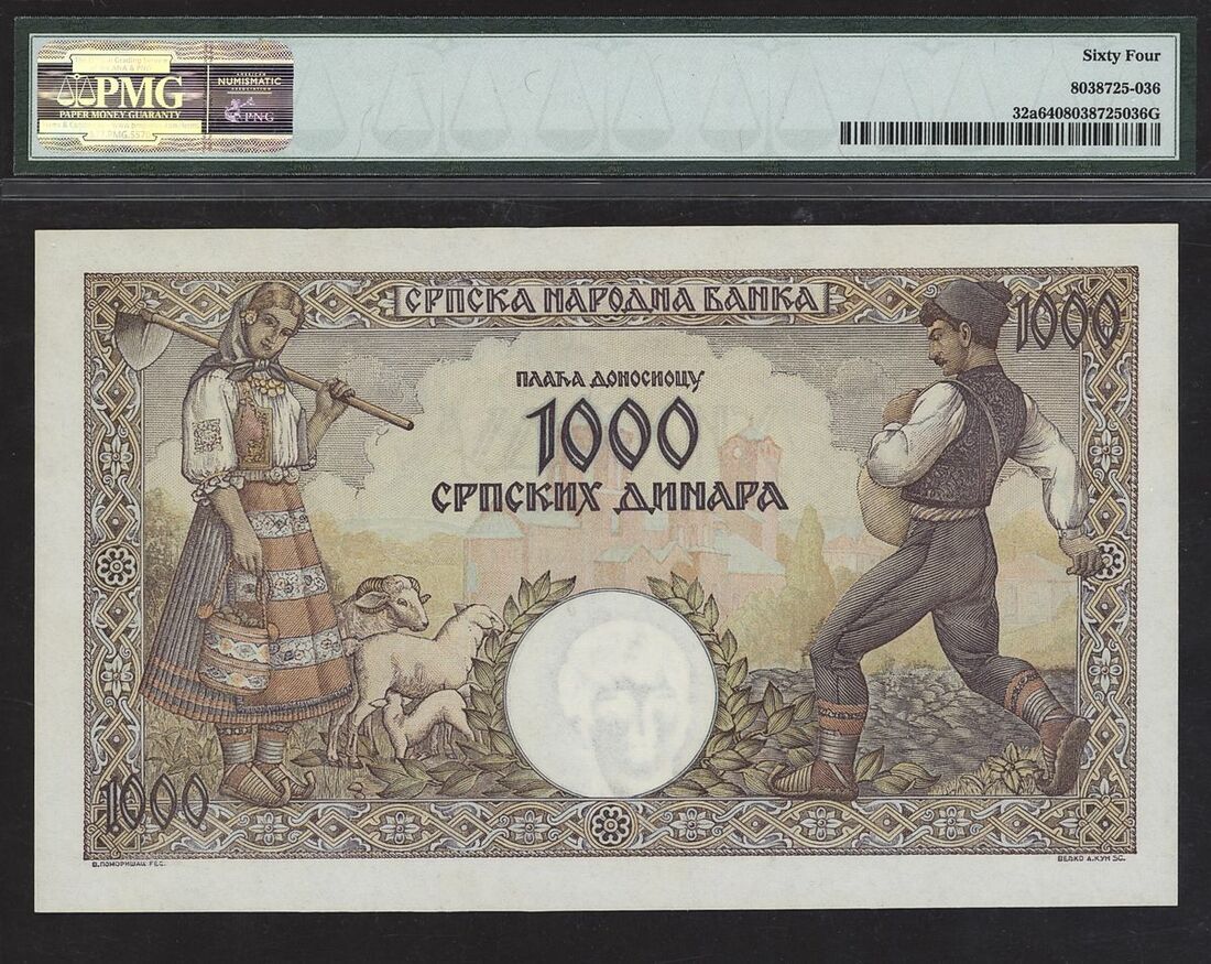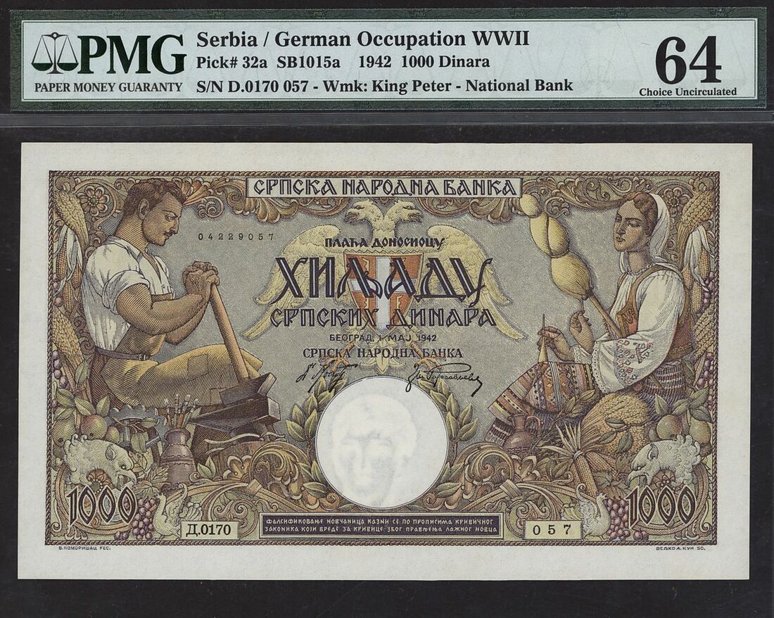 (x) German Occupation WWII, Serbia 1000 Dinara, 1942, serial number D.0170 057, (Pick 32a), in PMG holder 64 Choice Uncirculated