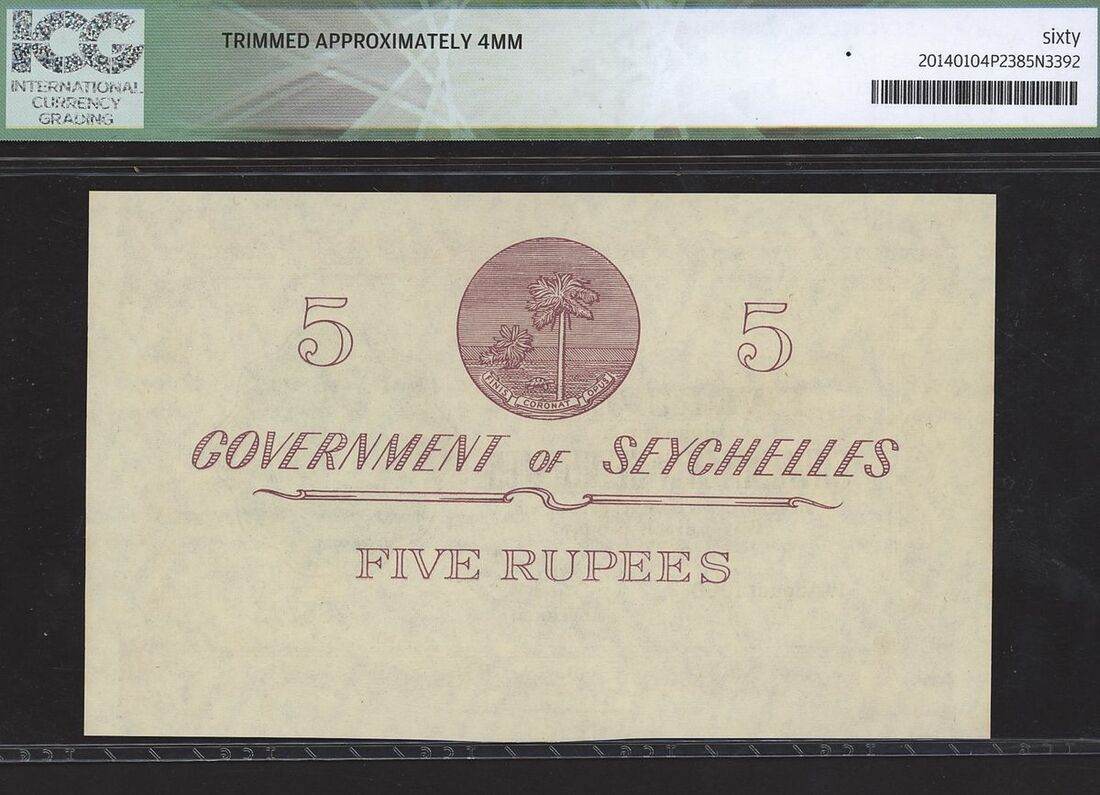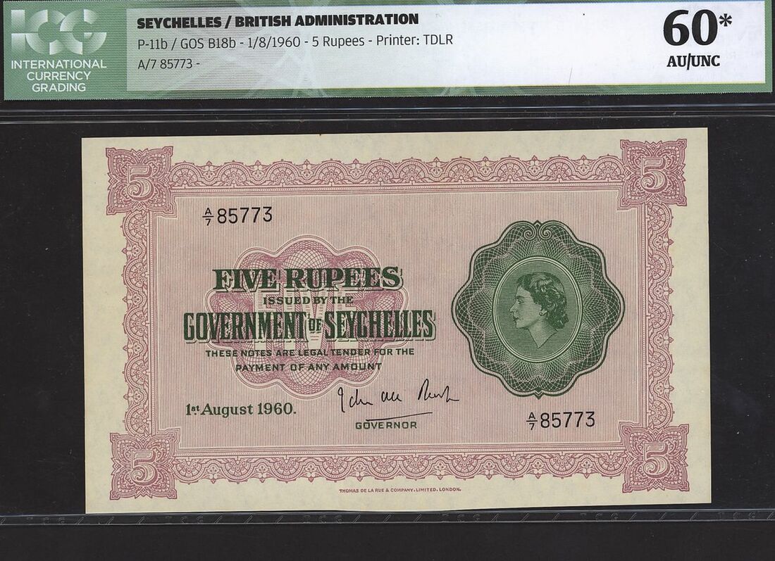 (x) British Administration, Seychelles, 5 rupees, 1960, serial number A/7 85773, (Pick 11b, BNB 118), in ICG holder 60 about uncirculated / uncirculated, trimmed approximately 4mm