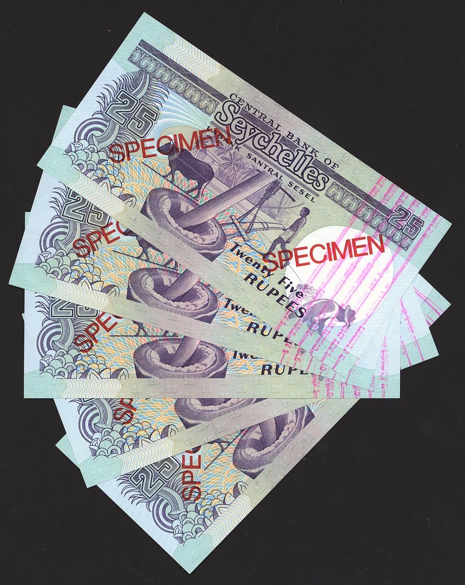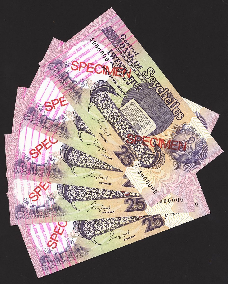 Central Bank of Seychelles, Group of (5) specimen 25 rupees, 1989, serial number A000000, (Pick 33s, BNB 406s), most unusual overprint (Metallic Thread Test Note Non-Negotiable) most likely used to calibrate counting machines that had detectors to validate the presence of the metallic thread slight flicks, 3 uncirculated, 2 about uncirculated (5 notes)