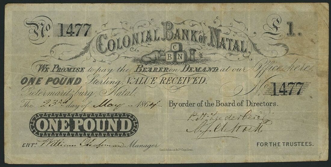 Colonial Bank of Natal, South Africa, £1, 23 May 1864, serial number 1477, black text on pale grey, bales with bank initials and cow and corn sheaf top centre, two manuscript signatures low right