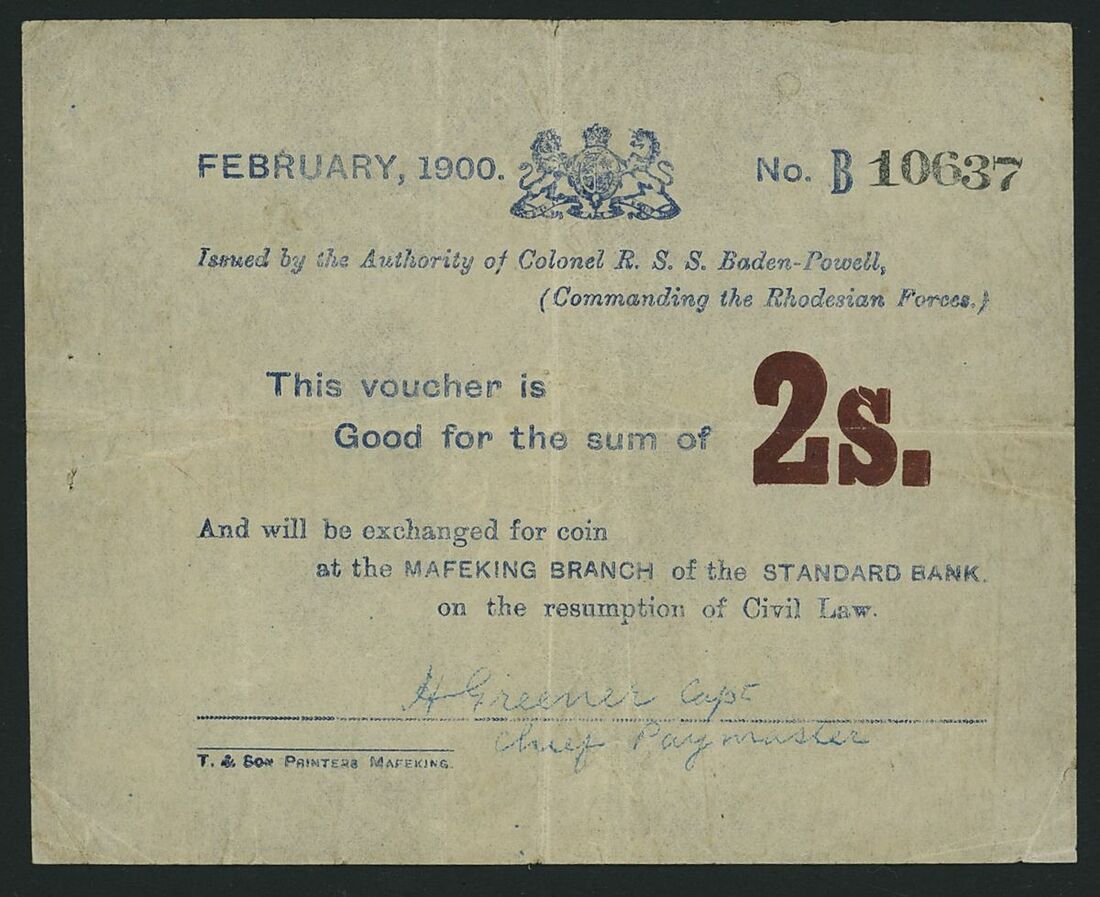 (x) Mafeking Seige / Boer War, South Africa, 2 shillings, February 1900, serial number B10637, (Pick S652b), very fine, pinholes