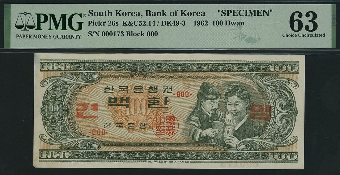 (x) Bank of Korea, South Korea, specimen 100 Hwan, 1962, serial number 000173, (Pick 26s, BNB 222), in PMG holder 63 Choice Uncirculated, previously mounted