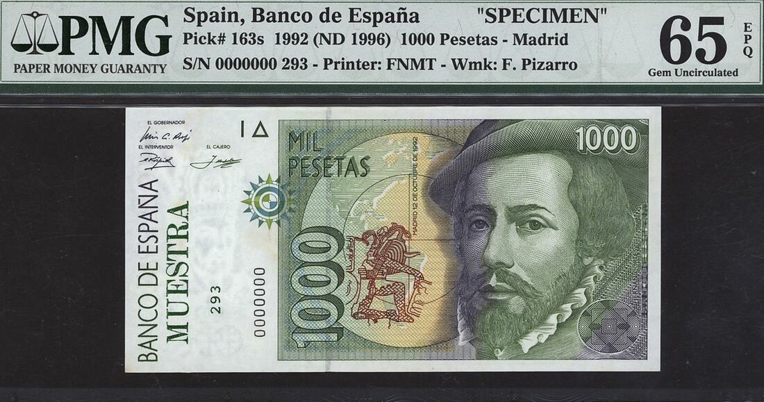 (x) Banco de Espana, Spain, specimen 1000 pesetas, ND (1996), serial number 0000000 293, (Pick 163s), in PMG holder 65 EPQ Gem Uncirculated