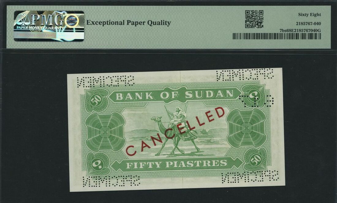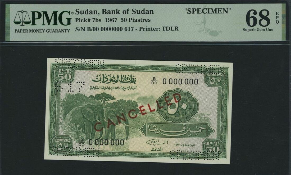 (x) Bank of Sudan, specimen 50 Piastres, 1967, serial number B/00 0000000 617, (Pick 7bs, BNB 302), in PMG holder 68 EPQ Superb Gem Uncirculated