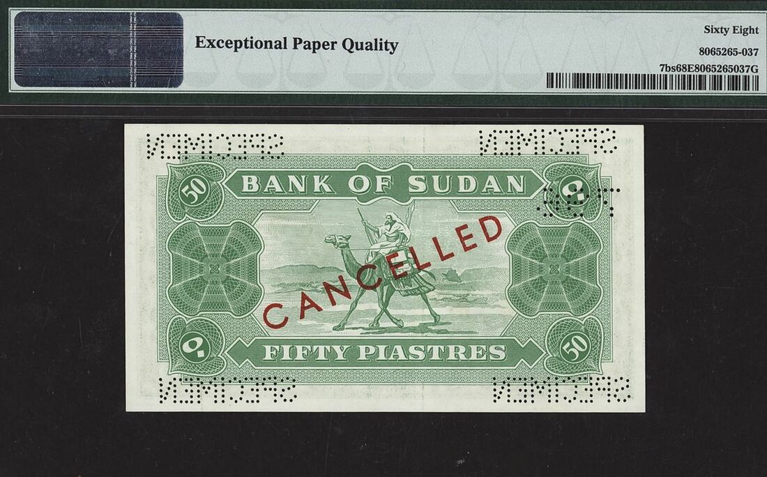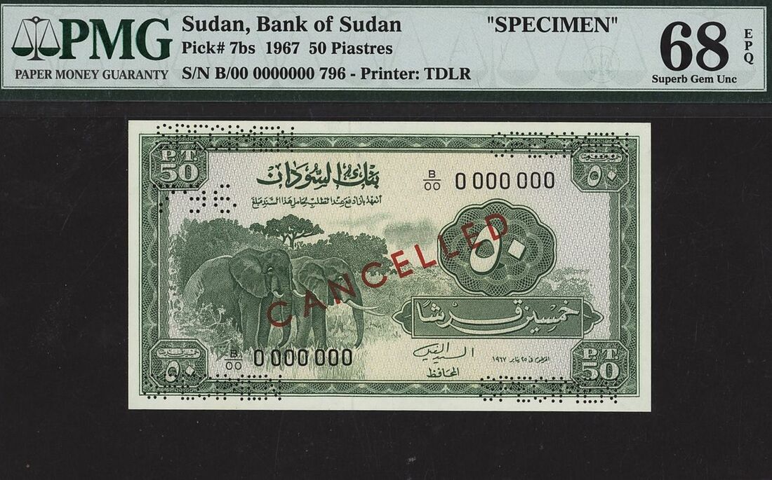 (x) Bank of Sudan, specimen 50 Piastres, 1967, serial number B/00 0000000 796, (Pick 7bs, BNB 302), in PMG holder 68 EPQ Superb Gem Uncirculated