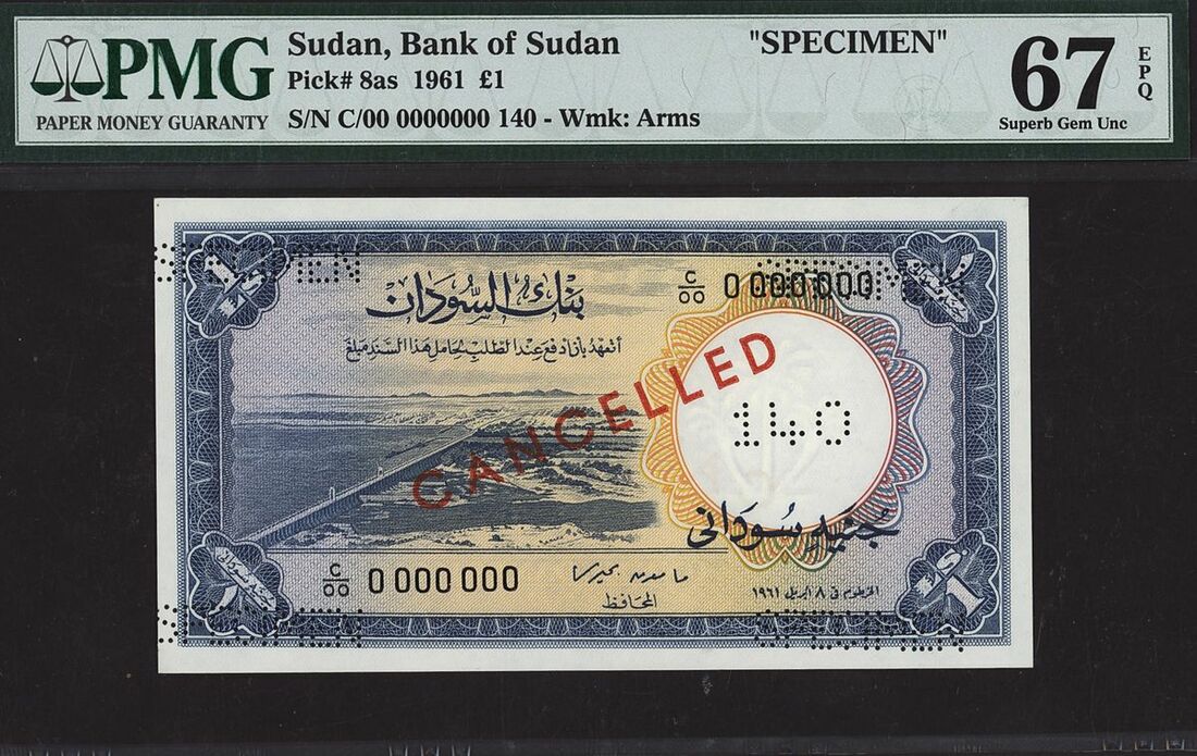(x) Bank of Sudan, specimen £1, 1961, serial number C/00 0000000 140, (Pick 8as, BNB 303), in PMG holder 67 EPQ Superb Gem Uncirculated, only 1 note in a higher grade on PMG Census
