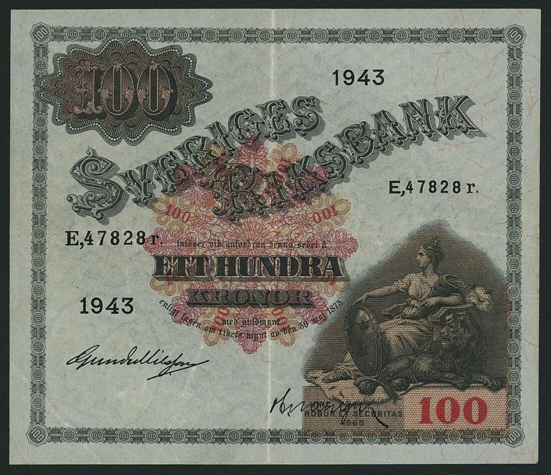 (x) Sveriges Riksbank, Sweden, 100 kronor, 1943, serial number E47828r, (Pick 36z), very fine