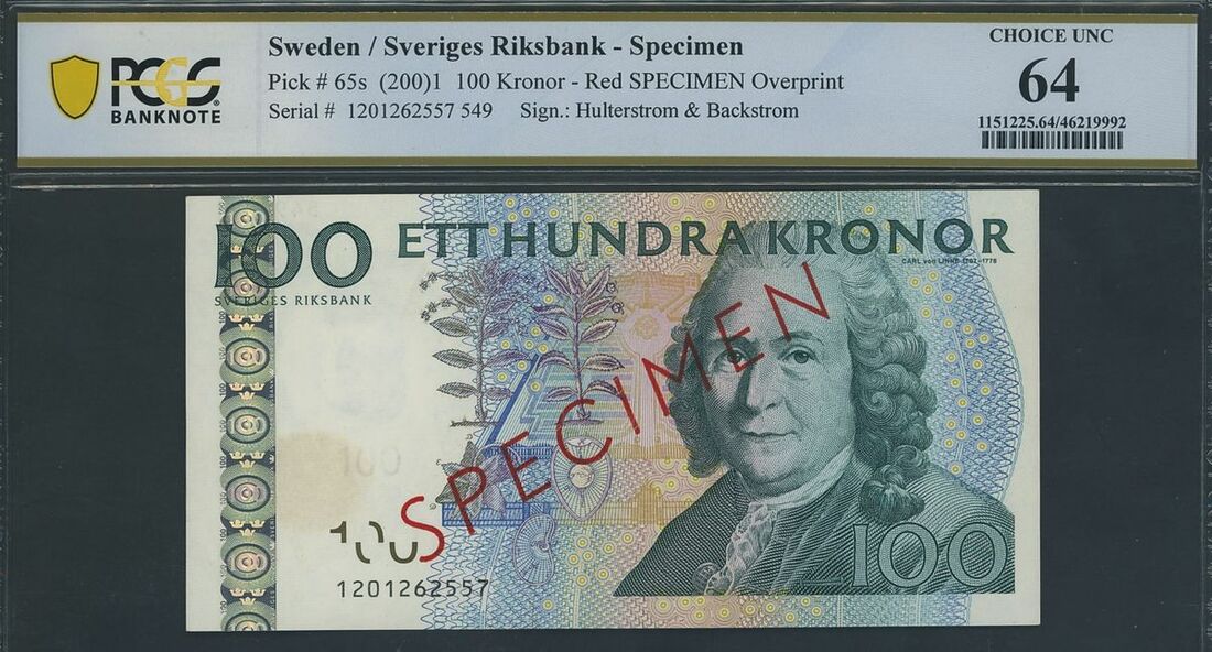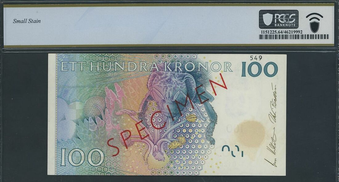 (x) Sveriges Riksbank, Sweden, Specimen 100 Kronor, 2001, serial number 1201262557 549, (Pick 65s), in PCGS holder 64 Choice Uncirculated, Small Stain