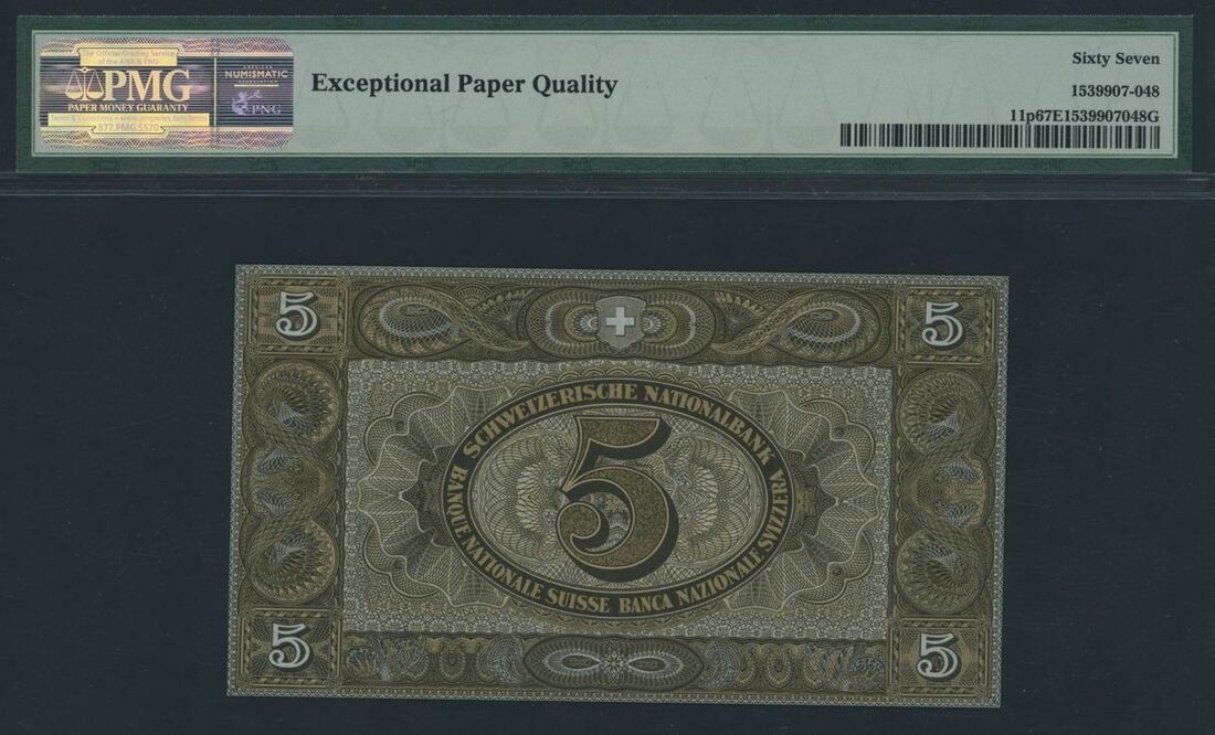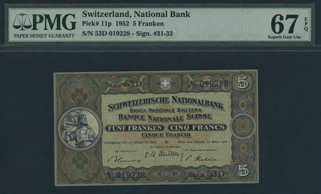 (x) National Bank, Switzerland, 5 Franken, 28th March 1952, serial number 53D 019228, (Pick 11p, BNB 305), in PMG holder 67 EPQ Superb Gem Uncirculated