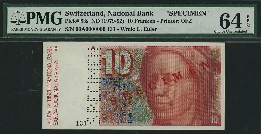 (x) National Bank, Switzerland, [Top Pop] specimen 10 Franken, ND (1979-92), serial number 00A0000000 131, (Pick 53s, BNB 337), in PMG holder 64 EPQ Choice Uncirculated (0 finer)