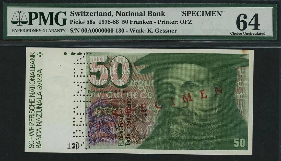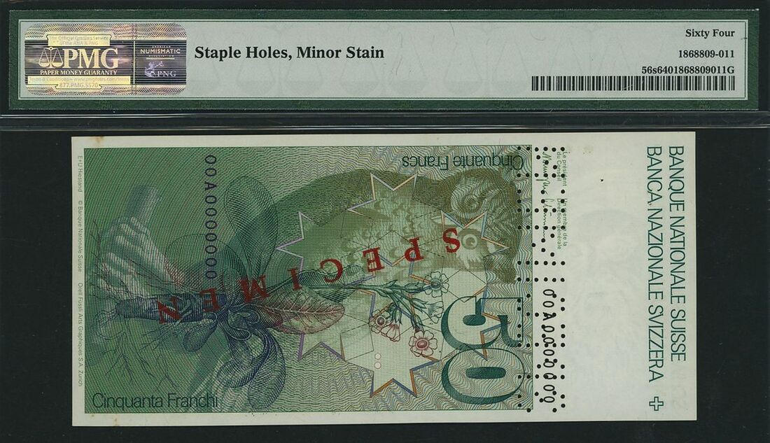 (x) National Bank, Switzerland, specimen 50 Franken, ND (1978-88), serial number 00A0000000 130, (Pick 56s, BNB 339), in PMG holder 64 Choice Uncirculated, staple holes, minor stain