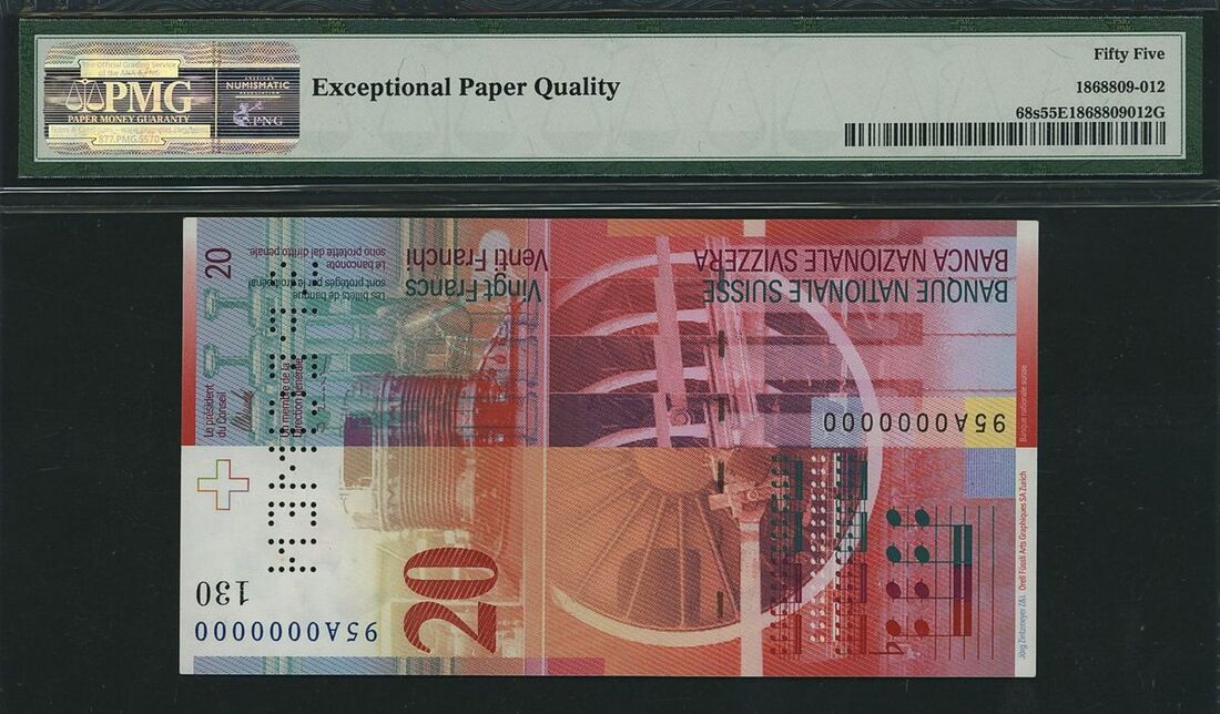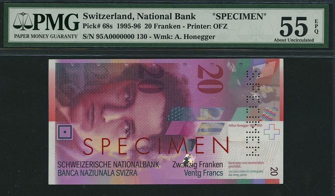 (x) National Bank, Switzerland, specimen 20 Franken ND (1995-96), serial number 95A0000000 130, (Pick 68s, BNB 350), in PMG holder 55 EPQ About Uncirculated,