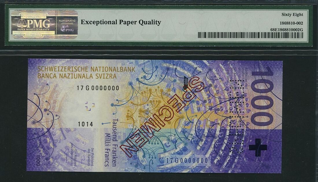 (x) National Bank, Switzerland, [Top Pop] specimen 1000 Franken, 2017, serial number 17G0000000 1014, (Pick not listed, BNB 360), in PMG holder 68 EPQ Superb Gem Uncirculated (0 finer)