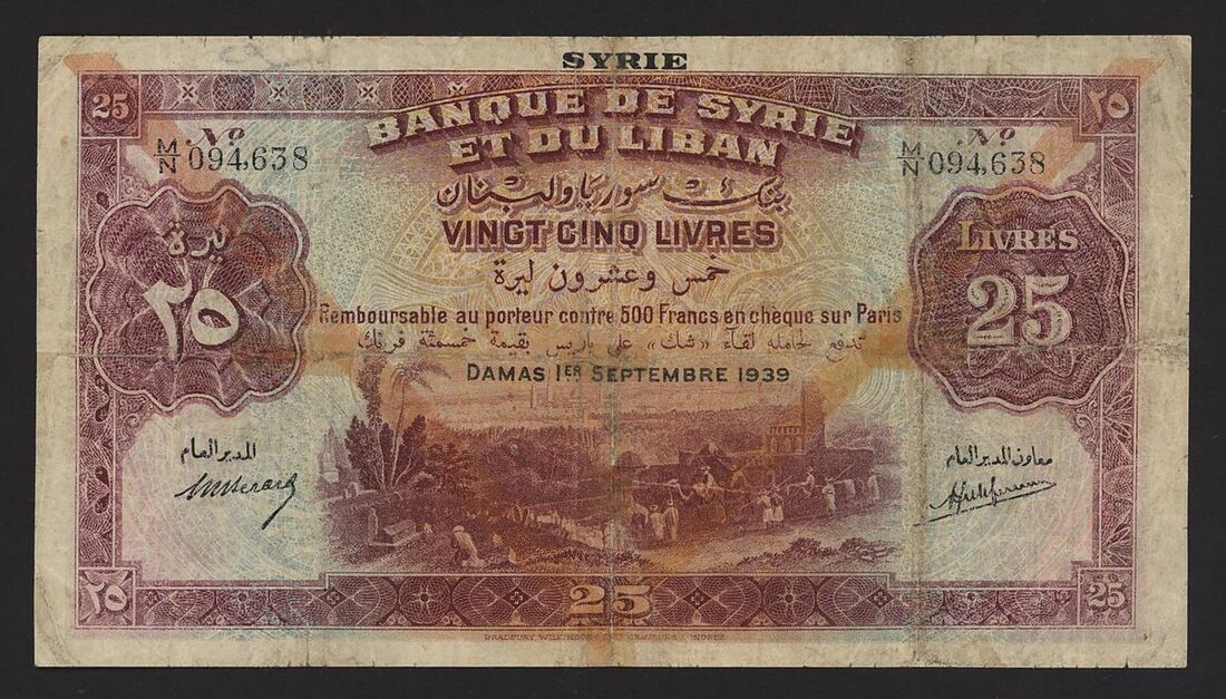 Banque de Syrie et du Liban, Syria, 25 livres, 1st September 1939, serial number M/N 094638, (Pick 43a, BNB 304), fine, tape repairs