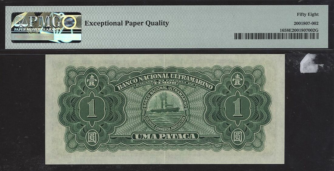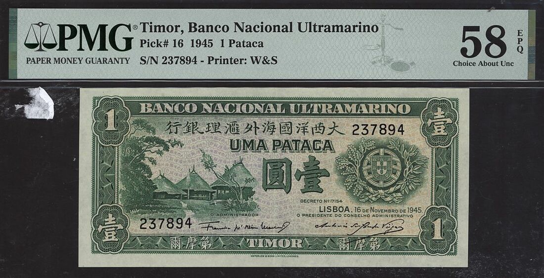 (x) Timor, Banco Nacional Ultramarino, 1 Pataca, 16th November 1945, serial number 237894, (Pick 16, BNB 118), in PMG holder 58 EPQ Choice About Uncirculated