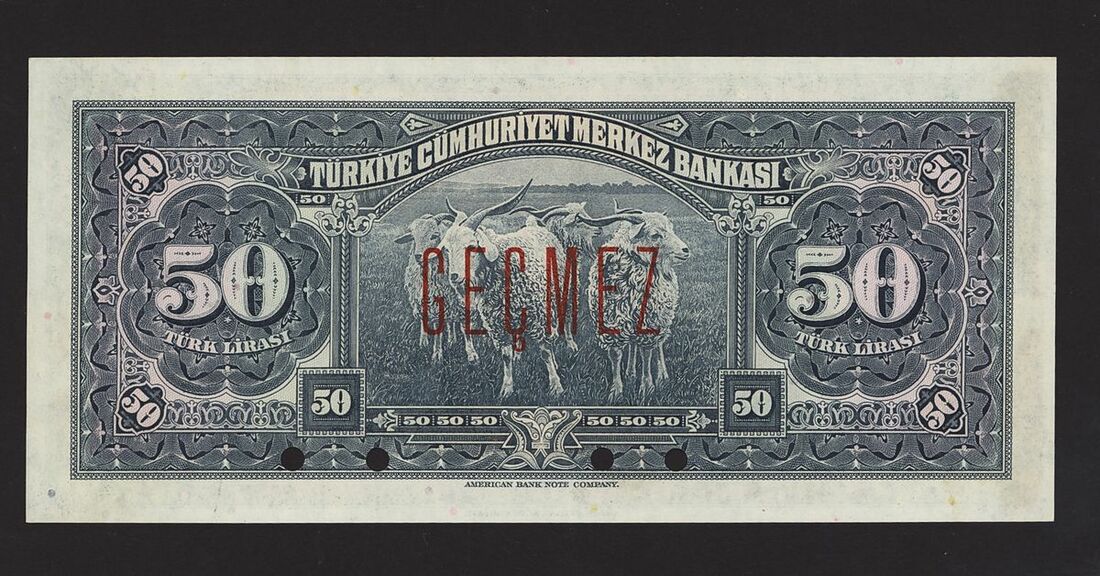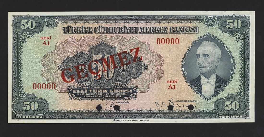 (x) Central Bank of Turkey, specimen 50 lira, 1930 (ND 1947), serial number A1 00000, (Pick 143s), uncirculated