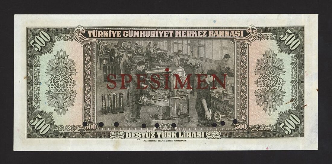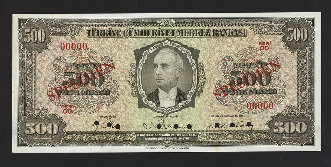 (x) Central Bank of Turkey, specimen 500 lira, 1930 (ND 1946), serial number 00 00000, (Pick 145s), about uncirculated