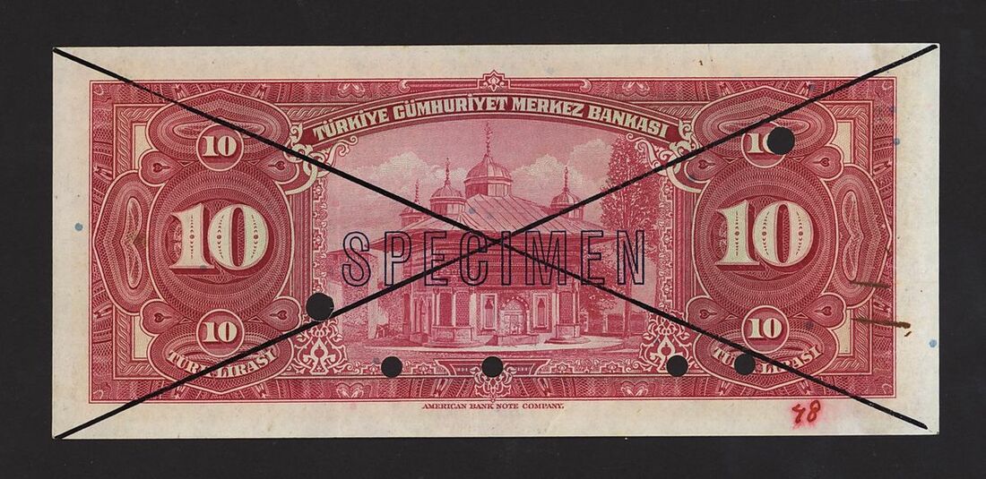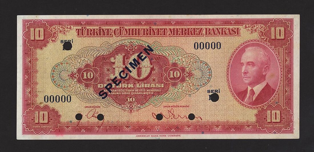 (x) Central Bank of Turkey, specimen 10 lira, 1930 (ND 1947), serial number 00000 48, (Pick 147s), extremely fine