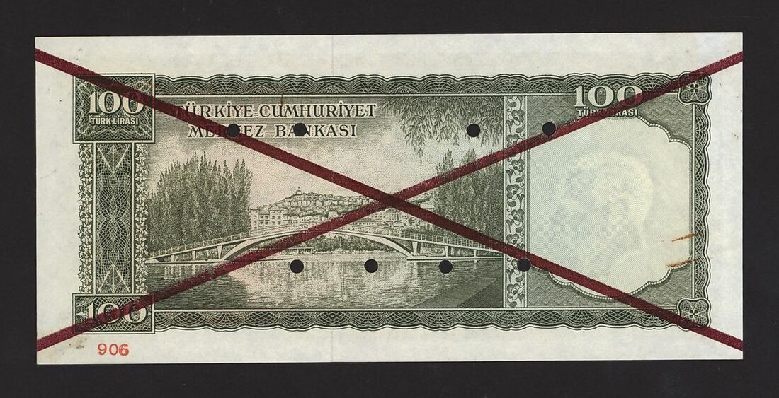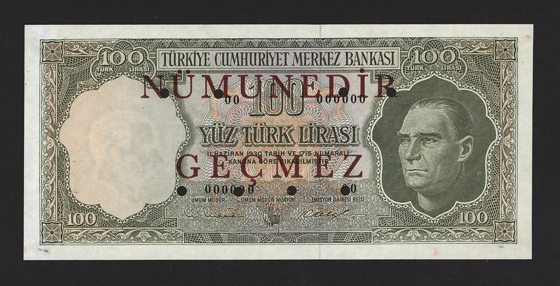 (x) Central Bank of Turkey, specimen 100 lira, 1930 (ND 1962), serial number 00 000000 906, (Pick 176s), uncirculated, rust
