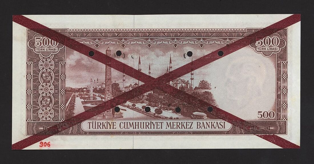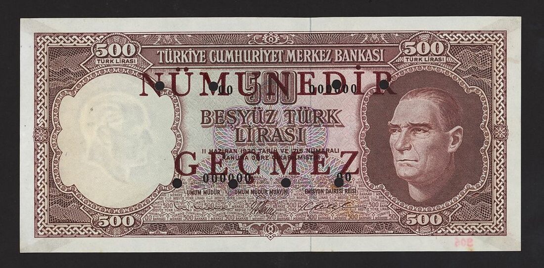 (x) Central Bank of Turkey, specimen 500 lira, 1930 (ND 1962), serial number 000000 906, (Pick 178s), about uncirculated