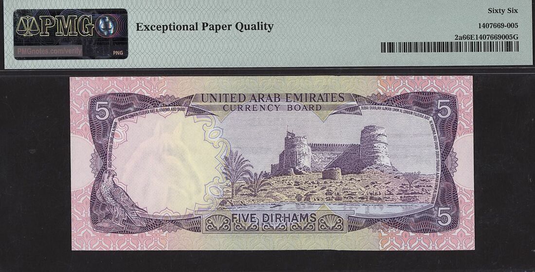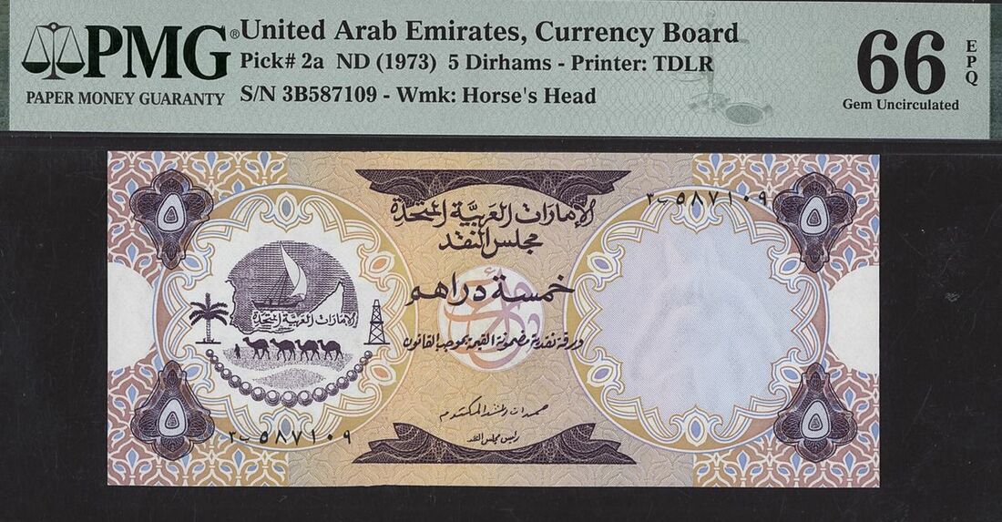 (x) United Arab Emirates, Currency Board, 5 Dirhams, ND (1973), serial number 3B587109, (Pick 2a, BNB 102), in PMG holder 66 EPQ Gem Uncirculated