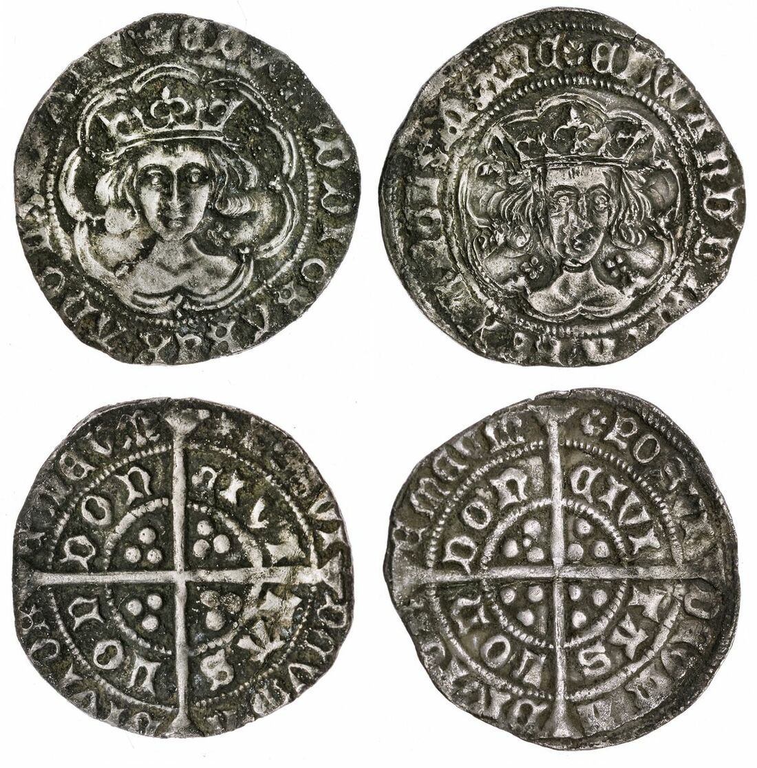 Edward IV, First Reign (1461-1470), Light Coinage, Groat, 1464-1465, London, crowned facing bust, quatrefoils at neck, rev. CIVITAS LONDON, long cross, no eye, 2.90g, 11h, m.m. rose (North 1567; Spink 2000), some doubling to the obverse and softness in parts, fine, the reverse better; another, Groat, 1468-1469, London, crowned facing bust, quatrefoils at neck, rev. CIVITAS LONDON, long cross, no eye, 3.08g, 1h, m.m. coronet (North 1567; Spink 2000), pitted surfaces from soil deposition, otherwise about very fine (2)
