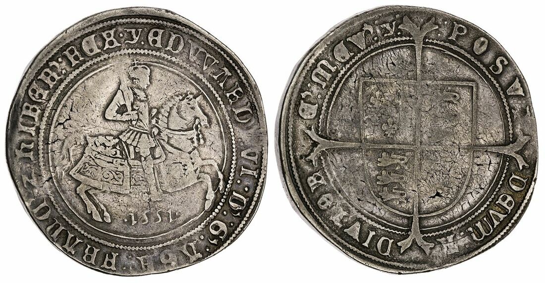 Edward VI (1547-1553), Third Period, Fine Silver Issue, 'Horseman' Crown, 1551, Southwark, (Under-Treasurer, Sir John Yorke), (m.m.) : EDVVARD ': VI : D ': G ': AGL ': FRANC ': Z : hIBER ': REX • King on horseback right, with date in Arabic numerals below horse, rev. : POSVI DEVM : A DIVTOR | E?• MEV?• (m.m.) : square-topped shield over long cross fourchée, small lys in first and fourth quarters, 30.21g, 3h, m.m. y [small on reverse] (Lingford dies A-unlisted; Rodney-Smith -; Barr -; Spink 2478; North 1933), slightly broad-struck and a trace off-centre, usual stress mark in fields, lightly cleaned but residually toned, scarcely fine at centres, better to peripheries, an excessively rare die combination with only two others recorded from this reverse die; unknown both to Lingford and Rodney-Smith