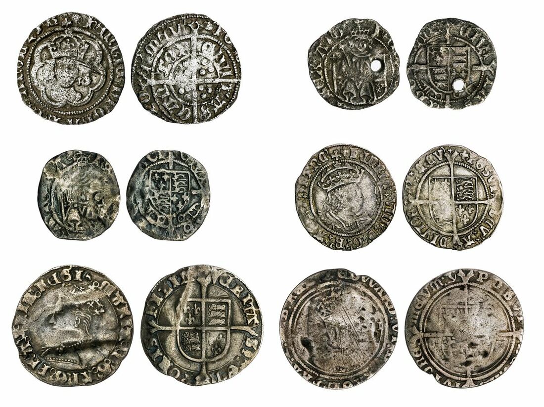 Tudor Silver Coins (6), including: Henry VII (1485-1509) (3), 'Facing Bust' Issue, Halfgroat, Type IIIc, Canterbury, crowned facing bust, rev. CIVITAS CANTOR, no stops, long cross fourchée, trio of pellets in angles, 1.40g, 7h, m.m. tun (North 1712; Spink 2211), porous, scratch across the face, clipping obscures some of the legends, fair; also, "Sovereign" Pennies, York, Archbishop Rotherham (2), throne of two single pillars, rev. CIVITAS EBORACI, quartered shield of arms over long cross fourchée, keys flanking below, 0.77g, 12h (North 1727; Allen Type 1i; Spink 2235), creased, flat, toned, about good; another, similar, saltire crosses on the seat of the throne, 0.68g, 3h (North 1729; Allen Type 3iv; Spink 2238), pierced and irregular almost very fine; another, Henry VIII (1509-1547), Second Coinage, Groat, 1526-1544, Tower, crowned bust right, rev. square-topped shield over long cross fourchée, saltire stops, 2.49g, 1h, m.m. lys (Laker bust D; North 1797; Spink 2337E), details of face worn away, otherwise, fine or better; also, Edward VI (1547-1553), Third Period, Fine Silver Issue, Shilling, 1551-1553, Southwark, crowned facing bust, dividing rose and value, rev. square-topped shield over long cross fourchée, 3.97g, 4h, m.m. y (North 1937; Spink 2482), clipped, scratched and mostly flat; also, Mary, Solus (1553-1554), Groat, Tower, crowned bust left, rev. square-topped shield over cross fourchée, 1.79g, 9h (North 1960; Spink 2492), flan bent in two places, owing to a level of wear, much of bust obscured but reverse much better, poor/good (6)